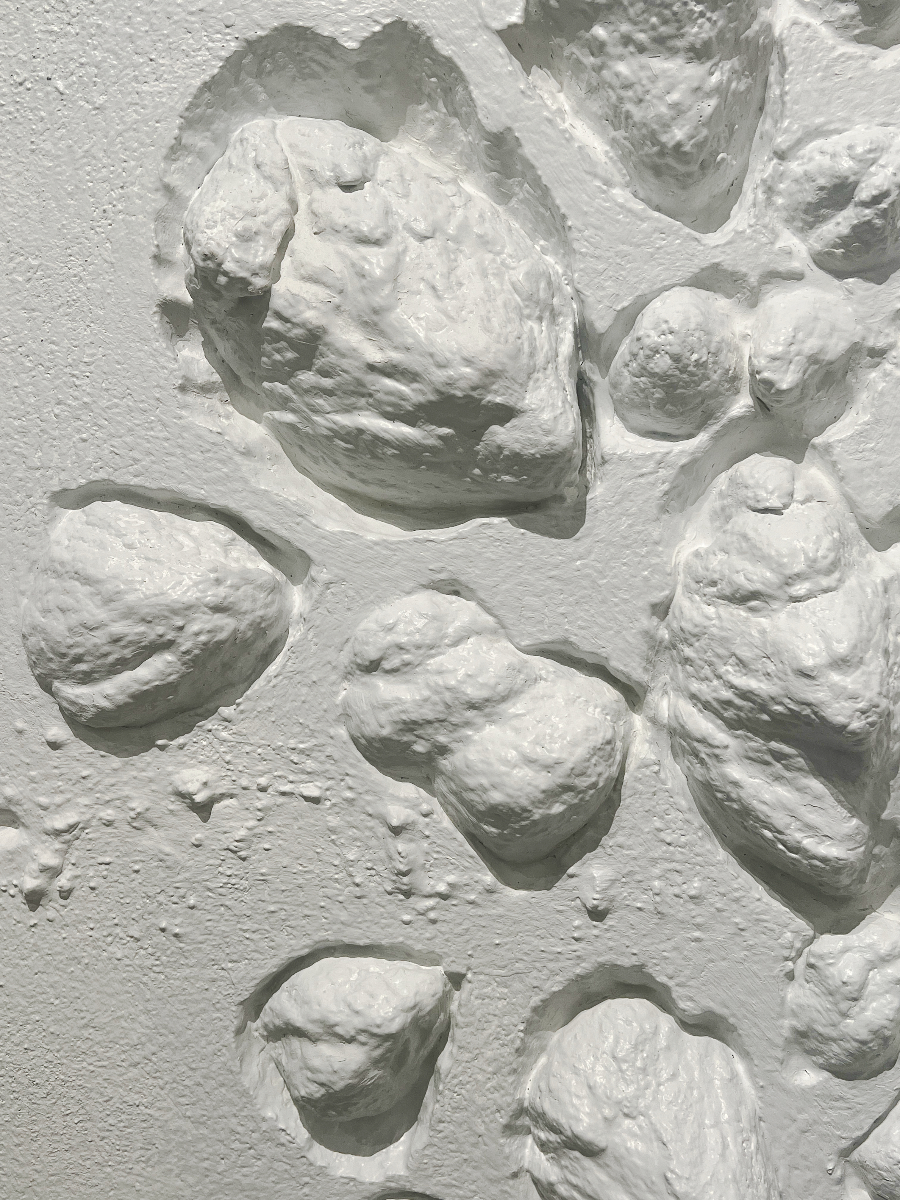 In the space where a body would rest are a series of protrusions where pieces of the mattress were violently removed, inverted, shoved back into place, and then buried under gallons of paint; a series of gestures that mirror the disruptive ways that experiences can become deeply integrated and repressed within the self.
